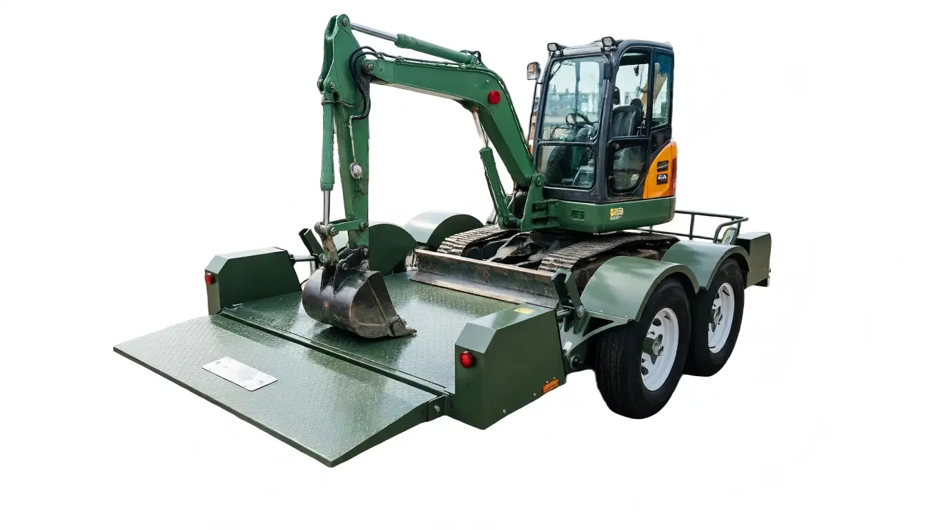 Transportasi Mesin Konstruksi: Cocok untuk mengangkut mini excavator, skid steer loader (Bobcats), atau penggiling jalan kecil.
